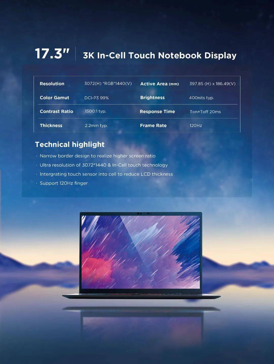 据悉,17.3吋3K轻薄触控屏是目前全球最大可量产的笔电In-cell触控屏,兼具高色域(DCI-P3)、窄边框、轻薄化(2.2mm)、高分辨率、高触控精度等多项技术特性,为用户带来操控与画质的双重升级体验;其触控性能支持手指120Hz触控帧频,同时兼容主动笔240Hz报点,在生产力上有所提升。此屏已在TCL华星武汉工厂跨入量产阶段,自今年5月起将持续出货。