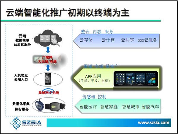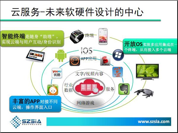 深圳市半导体行业协会秘书长蔡锦江在近期的一场《从云端服务看智能化电子产品创新》的主题演讲中指出,云服务将是未来软硬件设计的中心,并认为云端智能化推广初期会以终端为主,通过智能终端(如手机、平板电脑、智能电视等)推广云端APP入口,积累用户以丰富和优化云端内容和服务。
