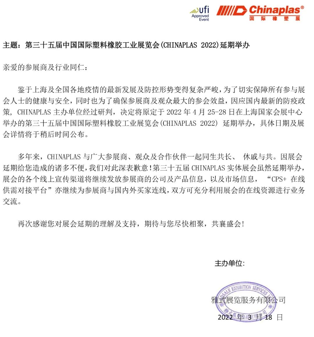 鉴于上海及全国各地疫情的最新发展及防控形势变得复杂严峻,为了切实保障所有参与展会人士的健康与安全,同时也为了确保参展商及观众最大的参会效益,因应国内最新的防疫政策,CHINAPLAS主办单位经过研判,决定将原定于2022年4月25-28日在上海国家会展中心举办的第三十五届中国国际塑料橡胶工业展览会(CHINAPLAS 2022) 延期举办,具体日期及展会详情将于稍后时间公布。