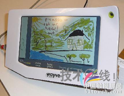 “Wayve”。配备触摸屏的无线LAN终端。用户可与他人轻松共享用手指在屏幕上绘制的图画。终端的右上角装有摄像头,可导入摄像头拍摄的照片,并在屏幕上添加留言转发给其他用户。英国TTP公司(The Technology Partnership plc)和微软打算共同成立英国Wayve公司。预定2009年中期上市该终端。