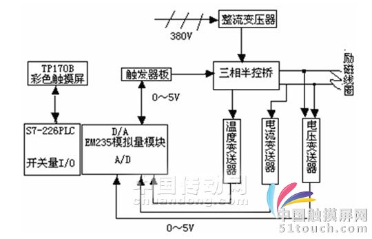 系统由5部分组成:变送器、PLC主机、模拟量输入输出模块、触摸屏、可控硅整流部分等组成,系统控制结构如图1所示。在控制部分,选用SIEMENS 的S7-200 PLC 对采样信号进行快速、可靠的处理,编程软件为STEP 7-MicroWIN 32 V3.2;选用SIEMENS 的TP270B触摸式人机界面(HMI)对实时温度值和各种故障信息进行显示、记录,组态软件为SIMATIC Pro-Tool V6.0。HMI 和PLC 之间采用MPI( 多点)通讯方式,通过对HMI 画面上所设元件属性和与PLC 的数据交换地址的定义,实现HMI 上相关元件对应的暂存器对PLC 存储单元的读写。