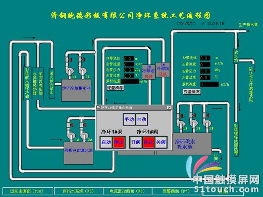 北京时间02月05日消息,中国触摸屏网讯, 净环水处理自动化控制系统是连续热镀锌及彩涂工程的供水系统。对水处理进行自动化监测和实时控制,是提高水处理效率、降低能耗的关键。采用以PLC为核心的工艺过程自动监控系统,对所有泵、阀实现自动监控,对曝气设备、排水设备的运行进行编程控制。根据工艺可以实时控制冷却塔风机、水泵、电动阀等设备。使水的流量、温度满足工业用水要求,以达到自动控制水处理过程的目的。