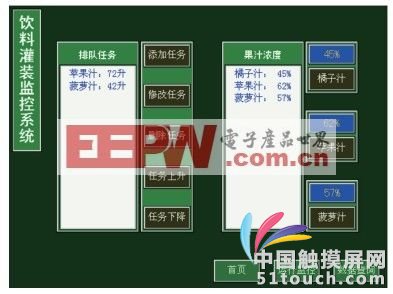 在操作现场,工作人员通过人机界面的“运行监控”画面实时了解系统的运行状态、存料信息、当前任务、环境温湿度等信息。“数据查询”画面中列举了历史灌装任务,方便后期产量核算与质量监控。高权限等级的工作人员(例如工厂管理人员)通过验证身份(用户/密码)进入“任务管理”,修改灌装任务与果汁浓度。