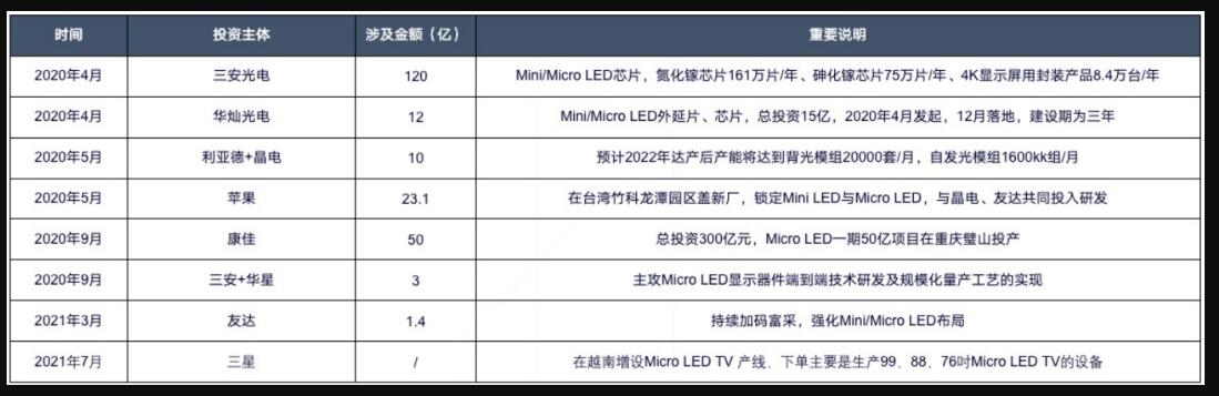 除了三星近期在Micro LED的动态引人注目,今年,苹果、索尼、友达、錼创、利亚德、康佳、天马等国内外显示大厂在Micro LED上多次强势出招,频发新品、增设产线、技术升级……下表是整理了去年至今产业玩家在Micro LED领域的投资情况。