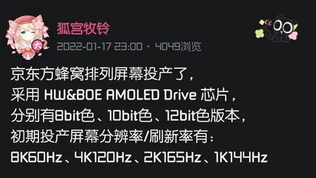 1 月 18 日消息,据华为成都研究所 up 主狐宫牧铃昨日在B站爆料,京东方蜂窝排列屏幕已投产。