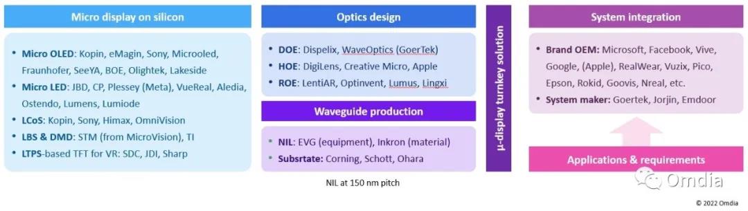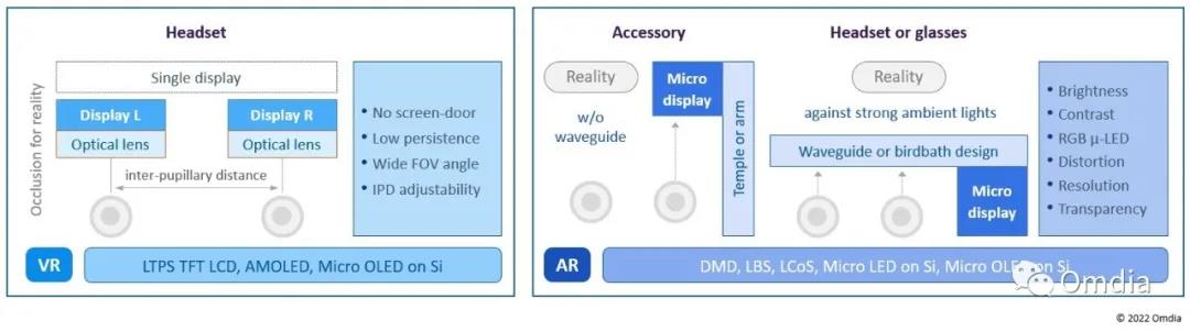 使用这些穿戴式AR设备时,影像显示来自微型显示器发射;然后光线被引导进入波导光学元件中。波导光学元件是轻薄而接近透明的,所以使用者可以同时看到现实世界与虚拟世界的物件在波导光学元件中迭合。波导光学元件的作用原理有绕射(diffusion)或是全息(holography)等作法。不幸的是,光线通过波导后的损失几乎达到99%,这样会使得微弱的光线在现实世界的强光反差之下更显得微弱、不明,因此,高亮度对AR显示器至关重要。总的来说,与AR显示器相比,VR显示器的供应链、彩色技术已经相当成熟。这是因为已经大量生产的LTPS TFT LCD或AMOLED显示器被广泛使用,而且许多面板厂商已经存在 ,像是JDI、SHARP和Samsung Display等。