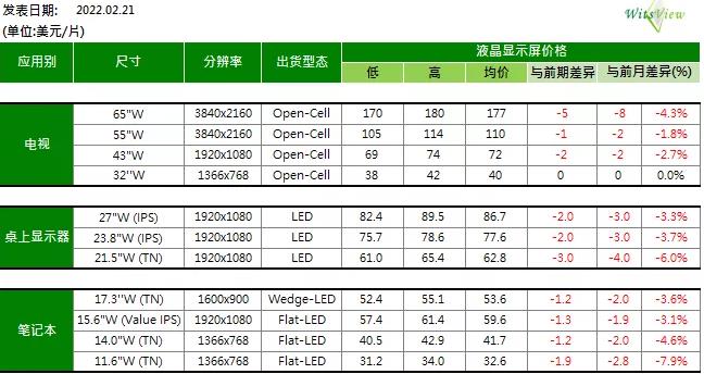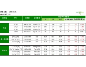 IT面板来看,范博毓表示,供过于求的问题仍在,驱动IC等零组件缺货问题缓和、供给瓶颈打开,但市场进入传统淡季,需求明显走弱,因此IT面板价格跌幅逐月扩大。监视器面板来看,2月下旬平均都有2~3美元的跌幅,21.5吋面板均价来到62.8美元,23.8吋面板均价约77.6美元,而27吋面板均价约86.7美元。