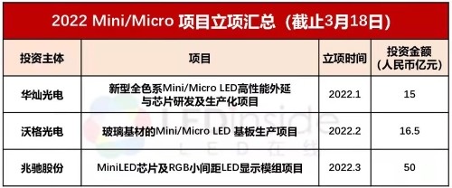 2022年至今已新增3个10亿级Mini/Micro LED项目