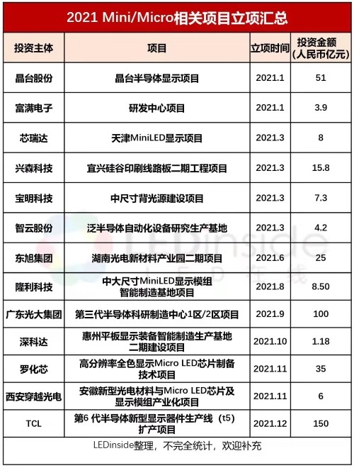 LEDinside根据相关资料统计,2021年共有14个Mini/Micro LED相关项目立项,涵盖产业链设备、材料、封装等环节,包含6个十亿级以上的项目。