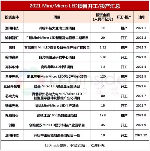 除有14个项目立项外,据LEDinside统计,2021年国内共有12个Mini/Micro LED相关项目相继开工和投产,涉及芯片、封装、面板等环节。