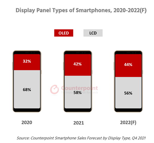 北京时间03月28日消息,中国触摸屏网讯, 曾经主宰智能手机显示屏的LCD正逐渐让位于OLED。在过去几年中,OLED被广泛认为是一种更先进的显示器,其在小面板市场的份额稳步增加。不过,2022年,OLED的增长步伐可能会放缓。Counterpoint预测,2022年OLED在全球智能手机显示屏类型中的份额仅同比增长2%至44%,而2021年同比增长10%至42%。