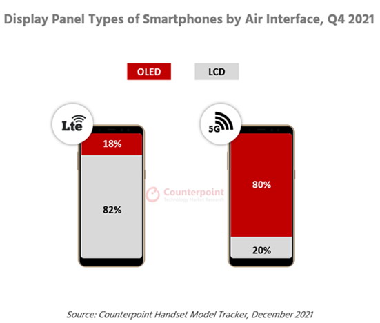 尽管如此,从长远来看,OLED在智能手机中取代LCD的趋势并没有改变,这与5G市场的增长息息相关。由于5G手机比LTE手机消耗电池的速度更快,因此更节能的OLED面板是终端厂商们的首选。2021年第四季度销售的智能手机,LTE智能手机LCD和OLED面板的采用比例为82:18,但对于5G智能手机而言,这一比例则变为为20:80。