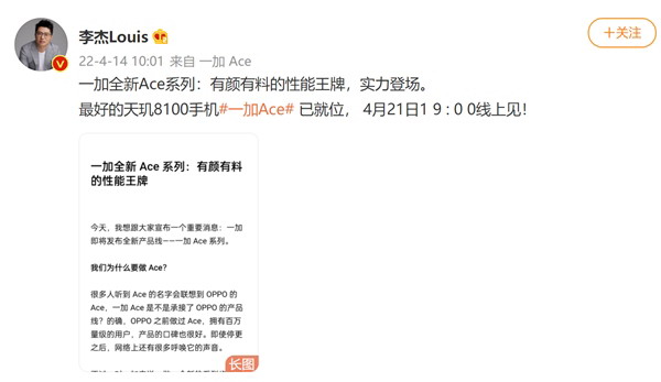 4月21日,性能王牌一加Ace即将登场,敬请期待。