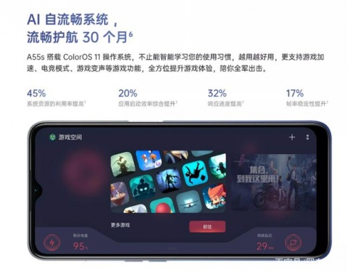 而作为该机亮点之一,OPPO A55s搭载ColorOS 11操作系统,系统资源利用率提高45%、应用启动效率综合提升20%、响应速度提高32%、帧率稳定性提升17%。官方表示可流畅护航30个月,不止能智能学习用户使用习惯,让手机越用越好用,同时还支持游戏加速、电竞模式、游戏变声等游戏功能。