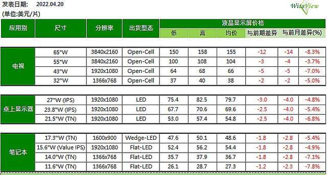 据集邦旗下WitsView 3月20日公布的4月下旬面板报价,受需求疲软影响,各尺寸电视面板全数转跌。特别是此前跌幅已经收窄的尺寸,又进一步大幅下跌。其中,65英寸单月下跌12美元,跌幅达8.28%;连续两个月持平的32英寸电视面板,4月下旬报价为38美元,较上月底下滑2美元,跌幅约5%;同期IT用LCD面板,同样受需求降温影响,维持跌势,跌幅达5-7%,其中笔电面板跌幅略高于显示器面板。