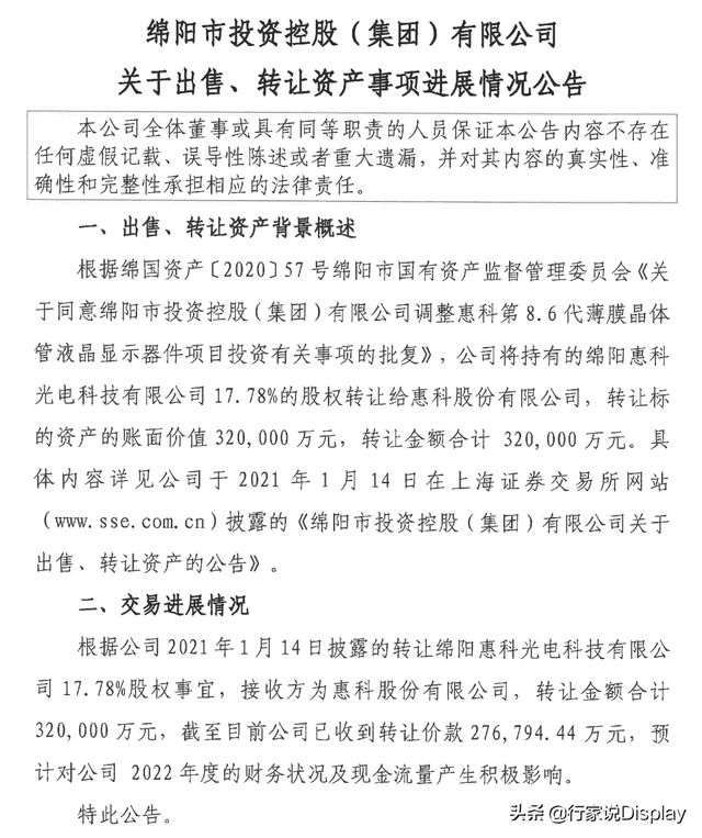 其中,绵阳惠科显示模组生产线项目首台生产设备于2022年5月25日搬入主厂房。该项目总投资50亿元,建成投产后主要生产面板后端产品,包括手机、车载显示、平板等中小尺寸显示屏,年产能为3100万片/年。