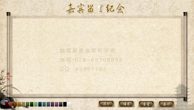 用手触摸界面上的“嘉宾留言纪念”按钮,即可进入相应的页面。在这个页面,仍然是一张展开的画轴为主。此页面主要分为4个区域版块。醒目的嘉宾留言纪念字幕为一个版块。画轴占据页面的中间主要位置为第二版块,在这个版块嘉宾可以进行签名留言,只需要使用手指,在触摸屏上面轻轻的书写即可。页面的左下角提供了颜色选择,你可以选择你喜欢的任意颜色,右下角并排的几个按钮都有相应的功能。触摸清除按钮,既可以立即清除你刚才书写的内容,不仅可以对你书写的内容进行保存,还可以进行查看。此触摸屏电子签名软件还有一个特别的功能,即你书写的文字会有笔锋的变化,是不是觉得非常的神奇呢?