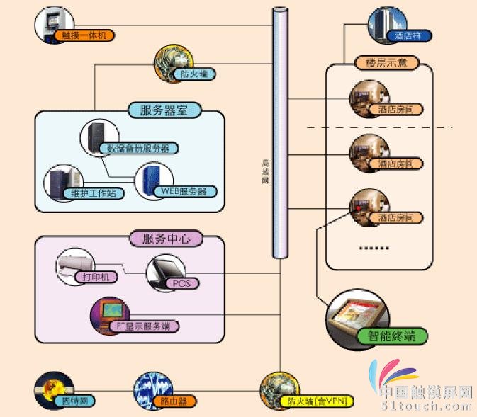 通过局域网连接客户服务中心和酒店的每一间客房,入住的国内外客人可以在触摸屏上自由选择包括汉语、英语、德语、法语、日语和韩语在内的多种语言界面,领略中国酒店提供的方便、快捷、丰富多彩的本地化服务。 而来自任一客房的服务请求都将在第一时间传输到客服中心,酒店工作人员可以高效、准确地安排客人的各种需求。除此之外,作为一个多媒体和终端PC平台,智能触摸系统还可以提供游戏,聊天,网上支付,以及视频点播等多种娱乐服务。