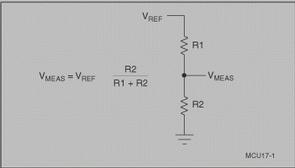 触摸屏包含上下叠合的两个透明层,四线和八线触摸屏由两层具有相同表面电阻的透明阻性材料组成,五线和七线触摸屏由一个阻性层和一个导电层组成,通常还要用一种弹性材料来将两层隔开。当触摸屏表面受到的压力(如通过笔尖或手指进行按压)足够大时,顶层与底层之间会产生接触。所有的电阻式触摸屏都采用分压器原理来产生代表X坐标和Y坐标的电压。如图3所示,分压器是通过将两个电阻进行串联来实现的。上面的电阻(R1)连接正参考电压(VREF),下面的电阻(R2)接地。两个电阻连接点处的电压测量值与下面那个电阻的阻值成正比。