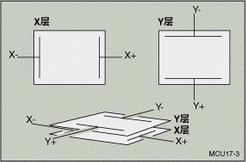为了在电阻式触摸屏上的特定方向测量一个坐标,需要对一个阻性层进行偏置:将它的一边接VREF,另一边接地。同时,将未偏置的那一层连接到一个ADC的高阻抗输入端。当触摸屏上的压力足够大,使两层之间发生接触时,电阻性表面被分隔为两个电阻。它们的阻值与触摸点到偏置边缘的距离成正比。触摸点与接地边之间的电阻相当于分压器中下面的那个电阻。因此,在未偏置层上测得的电压与触摸点到接地边之间的距离成正比。