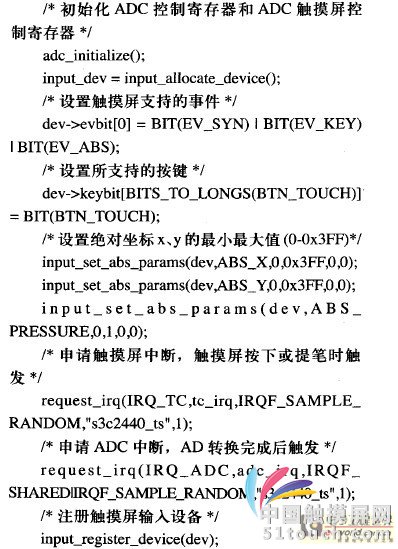 Linux驱动程序以内核模块方式加载运行。实现驱动加载函数s3c2440ts_init()并通过module_init(s3c2440ts_init)向内核注册。在驱动加载函数主要完成:启用ADC所需要的时钟、映射10地址、初始化ADC和触摸屏控制器相关的寄存器、申请INT_TS和INT_ADC中断、初始化输入设备、将输入设备注册到输入子系统。关键代码如下: