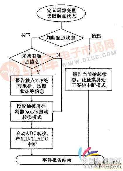 用户对触摸屏进行按下、抬起和拖动等操作时,触发中断INT_TS,内核进入到中断处理函数tc_irq0进行中断处理。tcirq0中,通过ADC—LOCK锁机制保证只有一个驱动程序使用ADC的中断线,通过读取ADCDAT0和ADCDAT1寄存器,判断触摸操作的状态,触摸笔按下时调用ts_timer_fireO进行数据转换。当数据转换完成时产进INT_ADC中断,内核进入中断处理函数adc—irqO,adc_irq()完成触点信息采集并调用ts_timer_fire()进行事件报告。事件报告流程如图2所示。