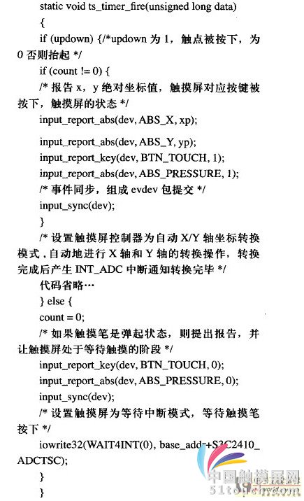 ts_timer_fire0是主要完成触点坐标信息向应用层报告。updown、count为静态全局变量,updown触点状态,count代表1个jiffies时间内ADC转换的次数,count为0,设置自动X/Y轴坐标转换模式,转换完成后产生相应的INT_ADC中断通知转换完毕。count不为0,input_report_abs()函数向输入子系统报告X,Y绝对坐标事件,inputreport_key()触摸屏对应按键被按下事件,输入子系统使用inputsync()将报告的事件组成一个evdev包,通过/dev/input/eventX发送出去,应用程序通过读取/dev/input/eventX即可获得事件信息。关键代码如下: