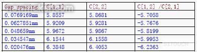 在我们给出的设计举例中,限于篇幅,仅仅列举出电容参数矩阵。在Q3D 的计算中,电阻矩阵的计算相对容易,消耗较小的计算机内存;而电容参数的计算,不仅仅是影响设计的关键因素,而且在Q3D 的仿真中消耗较多的计算机内存。下面只是列出电容计算的结果(1 和2 表示单元菱形结构编号,其实C[1,1]和C[2,2]是1 和2 两个菱形的自电容参数,C[1,2]和C[2,1]表示互电容)。
