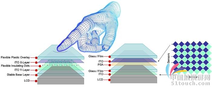 电阻式触控屏包括有一个柔性顶层,然后是一层ITO,一个空气隙,然后是另一层ITO。面板有4根线附到ITO层上:“X”层的左右侧各一根,“Y”层的顶端和底端各一根。