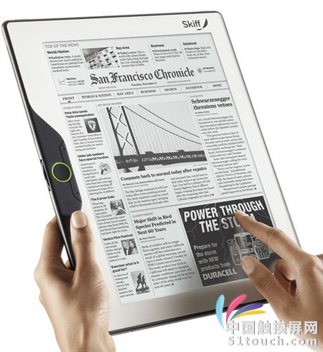 北京时间01月06日消息,中国触摸屏网讯, 美国出版界巨头赫斯特集团周一宣布,该公司将在本周拉斯维加斯举行的电子消费展(CES)中推出一款电子书阅读器。不过与Barnes & Noble已推出Nook和亚马逊的Kindle不同的是,即将推出的Skiff Reader拥有一个更大的屏幕,能够阅读报纸和杂志。在Skiff Reader正式上市之后,该产品将成为市场上最大的电子书阅读器。Skiff Reader拥有一个11.5英寸的触摸屏,分辨率达到1600 x 1200,高于当前市场上绝大多数的笔记本电脑。Skiff Reader配备了坚固的金属箔“防碎裂”面板,而且其外壳采用了高强度镁合金打造。