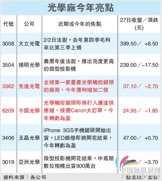北京时间01月28日消息,中国触摸屏网讯, 光学元件厂今年业绩可期,先进光电今年获利可望成长二倍;今国光将成广达第二供应厂商;玉晶光从元月起出货手机镜头给苹果电脑,亚洲光学今年逐步在微型投影机开花结果。
