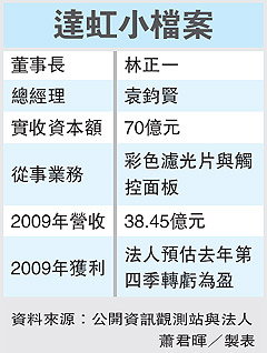 达虹原是彩色滤光片(CF)厂,友达、奇美电等面板厂纷纷自制CF之后,CF厂如达虹与和鑫就积极转型,跨入触控面板的生产。法人预期,达虹今年来自触控面板的营收,将首度超越CF,而且今年触控面板出货,将较去年成长一倍。