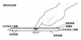 红外LED(IR LED)发射红外线进入诸如亚克力板(Acrylic),当亚克力面板的厚度大于8mm时,光线会发生在亚克力内不停反射,产生全内反射现象,当手指(或者其他材质如硅胶等有一定韧性和反射性的材料)碰到亚克力表面时,全内反射被破坏,光线被手指反射出来,此时,亚克力下方的红外摄像头(IR Camera)捕捉到手指反射的光斑,摄像头捕捉到的光斑会送到计算机进行处理,最终形成输入点。