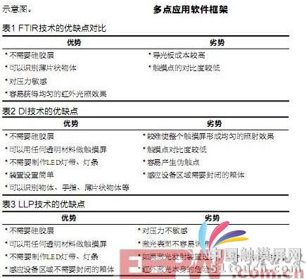 这种技术的优缺点如表1所示。DI方式原理比较简单,通过IR光源照射投影屏幕,形成均匀的照射效果,当有手指触摸屏幕表面时,IR光线会被反射,从而在成像设备上形成光斑。
