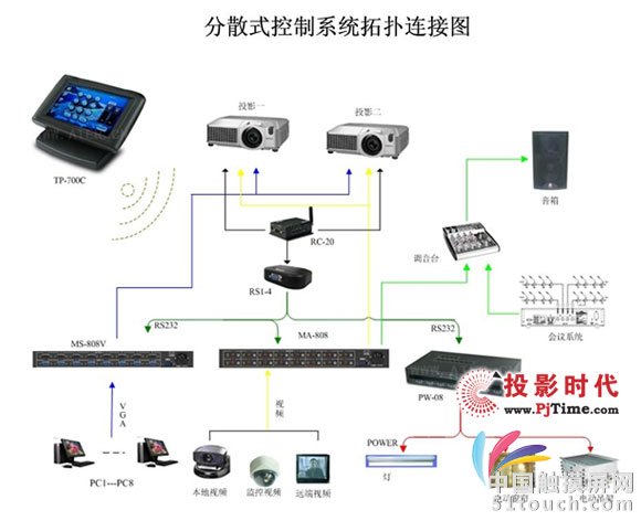 该系统仅通过ATER无线接收模块和触摸屏,控制了矩阵、投影机、继电器箱等设备,整个系统模块清晰,维护简单。