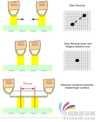手指间距定义为:当触控萤幕控制器回报两隻手指的位置时,两隻手指中心点之间于萤幕上的最短距离。手指间距量测方法(图2),是将两个模拟或机械手指置于面板上,然后逐渐拉近两隻手指的距离,直到系统回报两隻手指为一隻手指为止。有些触控萤幕供应商的手指间距是指边缘至边缘的距离,有些则是中心点之间的距离。10毫米机械手指的10毫米手指间距,意谓有多隻手指触碰到萤幕,或是手指之间的距离为10毫米,实际状况端视触控控制器的规格定义。