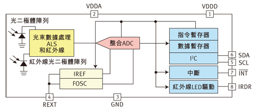 图3显示典型的数位环境光和近接感测器中的建构电路架构图。光二极体阵列是讯号调节与撷取光学前端的元件。整合的ADC可以把撷取到的光讯号转换成数位化的数据串流,然后再传送至微控制器进行后续处理,以实现不同应用需求。