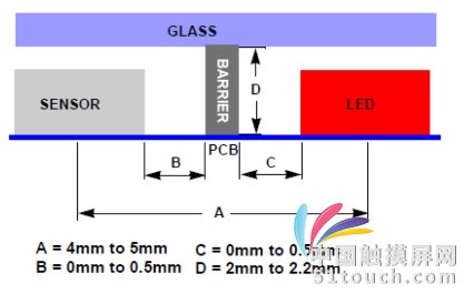 元件的配置在机械设计中起著十分关键的作用,它决定了近接探测的距离远近。这其中包括许多决定性因素:如感测器和光障碍物之间的空间距离、光障碍物和红外线LED之间的距离、障碍物高度的变化,以及是否使用光导管。图4显示了一款採用典型元件配置尺寸的近接感测系统解决方案。