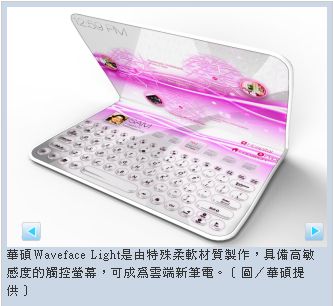 这三项「waveface」概念产品,有Waveface Light,是由特殊柔软材质製作,具备高敏感度的触控萤幕,可直接以平板电脑形式,少掉传统笔电的键盘,萤幕本身可以当成键盘,作为行动使用者进行云端运算的互动介面。当然,它也可以用键盘加萤幕的形式,成为新笔电,方便携带使用。