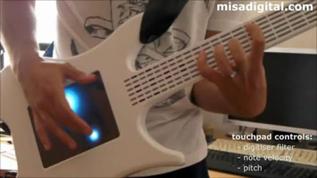 简单地说,Misa数码电吉他,就是将传统吉他的弦替换成了一块触摸屏,然后,当我们用手指在触摸屏上吹拉弹唱时,它会将这些动作转换成电信号,输入进吉他中一台linux系统的电脑处理,并输出数码合成的电吉他音——从视频来看,效果还不错,除了反应灵敏、音色出众外,触摸屏还能随着手指的动作闪烁出光点,所以视觉效果也算华丽,非常适合用来玩乐队现场演奏耍酷。
