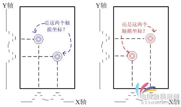 如果是单点触摸,则在X轴和Y轴方向的投影都是唯一的,组合出的坐标也是唯一的;如果在触摸屏上有两点触摸并且这两点不在同一X方向或者同一Y方向,则在X和Y方向分别有两个投影,则组合出4个坐标。显然,只有两个坐标是真实的,另外两个就是俗称的”鬼点”。因此,自电容屏无法实现真正的多点触摸。
